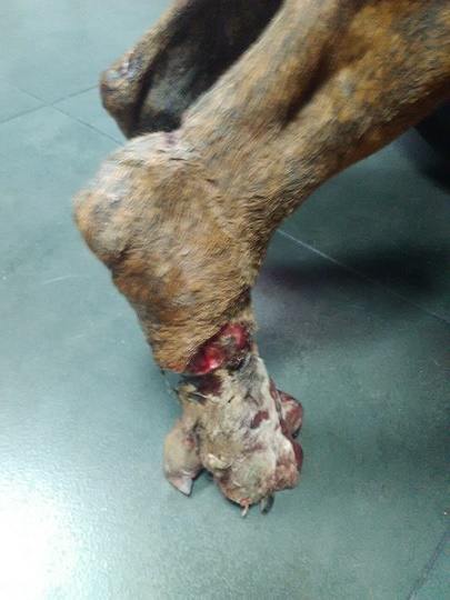 Was ihr passiert ist, können wir leider nicht sagen. Der Fuß ist komplett gesplittert, in der offenen Wunde hatten sich schon nette kleine Tierchen angesiedelt, der Wundbrand bis oben an den Knochen hochgewandert.