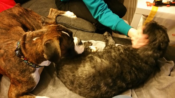 Meine Behinderung stört hier niemanden und mal ehrlich, man merkt es auch erst auf den zweiten oder dritten Blick, dass eines meiner Beinchen fehlt. Wir machen alles, was andere Menschen auch mit ihren Hunden unternehmen. Und natürlich hört abends die klassische Kuschelrunde dazu!