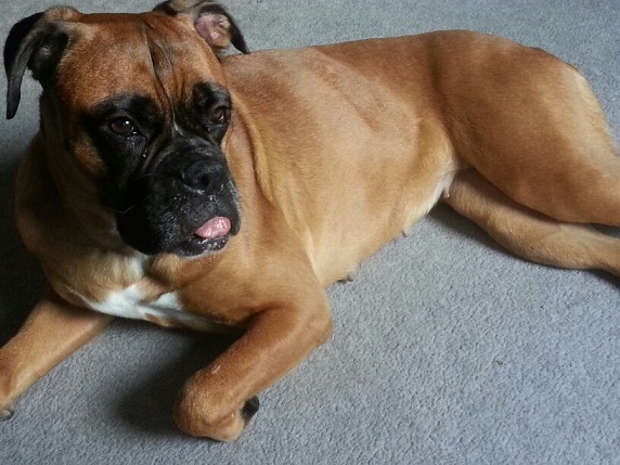 Macro ist eine sehr liebe Boxerhündin, die ein rein ästhetisches Problem mit ihrer Zunge hat,