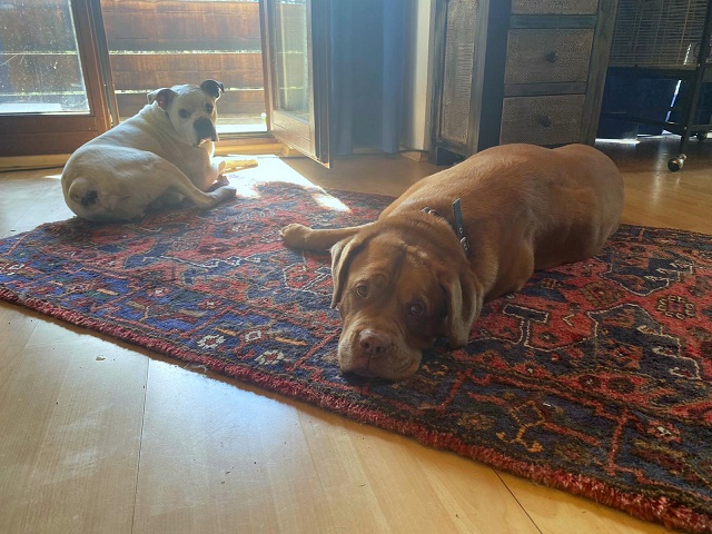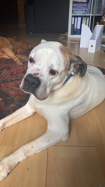 Hier lebe ich mit Bordeauxdoggendame Lotte problemlos zusammen und das war auch mit der Grund, dass ich bei meiner neuen Familie bleiben darf. Wir sind beide nicht mehr so taufrisch und es passt prima.
