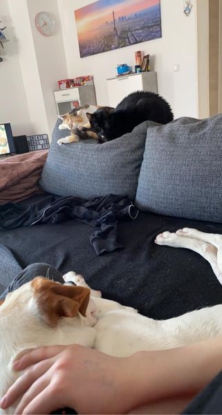 Hier lebe ich nun mit Frauchen und 2 Stubentiger zusammen. Ehrlich, so ganz hab ich die Felltiere noch nicht in mein Herz geschlossen. Doch wir arbeiten emsig daran.