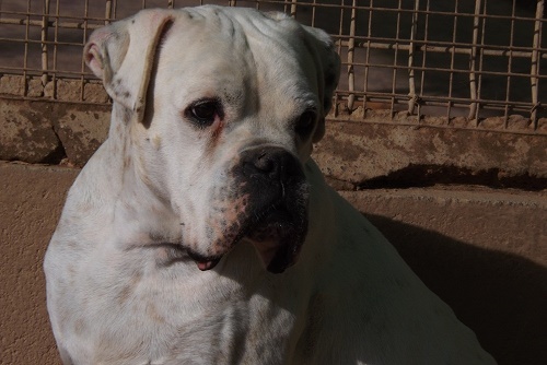 Max hat im Oberkiefer keine Zähne mehr. Ob er hören kann, können wir nicht sagen. Manchmal scheint es so – manchmal auch nicht. Es kann aber durchaus ein typischer Boxersturkopf sein, der ihn nur reagieren läßt , wenn es Futter oder Streicheleinheiten gibt.