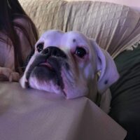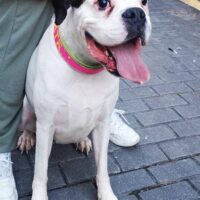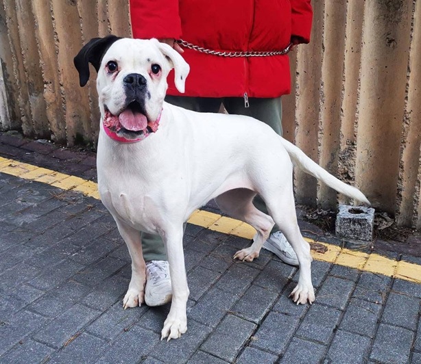 Maya ist eine wunderschöne weiße Boxerhündin mit einem außergewöhnlich lieben und fröhlichen Charakter.