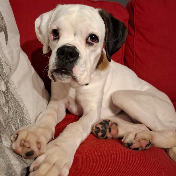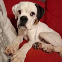 Mein Frauchen wollte nach dem Tod von Max, der auch über EHFB kam, wieder eine weiße Boxerschnute haben.