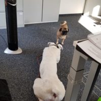 Mit der neuen Mama darf ich auch ins Büro. Da gibt es noch zwei kleine andere Hunde, die find ich klasse, aber es ist viel zu heiß im Moment um wild rum zu toben, also schlafen wir drei lieber.