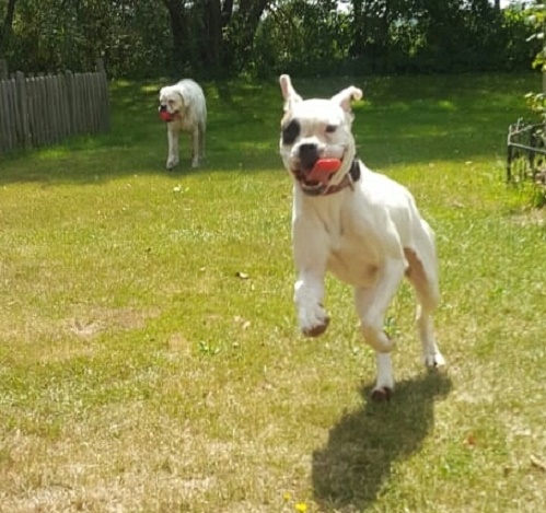 Jetzt bin ich schon etwas mehr als zwei Wochen in Deutschland. Nach der anstrengenden Reise bin ich dann doch glücklich in meinem neuen Zuhause gelandet! Dort wurde ich liebevoll aufgenommen. Am besten war, daß dort eine 11 1/2jährige Boxerhündin ist (auch weiß – Maja), die mich sofort in ihr Herz geschlossen hat und ich sie! Sie besucht mich jeden Tag und wir toben in unserem riesigen Gelände