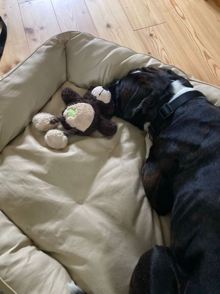 Sein ausgeprägter Jagdtrieb sorgt allerdings gelegentlich für spontane Aussetzer: Vögel, Katzen oder alles, was sich bewegt, wecken sofort sein inneres „Ich-bin-dann-mal-weg!“. Aber auch das bekommen wir gemeinsam hin. Da Negri – ganz boxertypisch – schnell aufdrehen kann, mitten in der Pubertät steckt und seine Ressourcen noch etwas zu sehr verteidigt, sind wildes Toben und Spielzeug momentan nicht angesagt. Dafür gibt es Denkspiele, Schnüffelaufgaben und kleine Trainingsübungen, die ihm mindestens genauso viel Spaß machen.