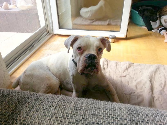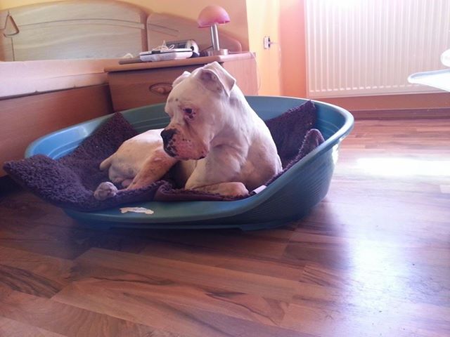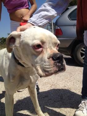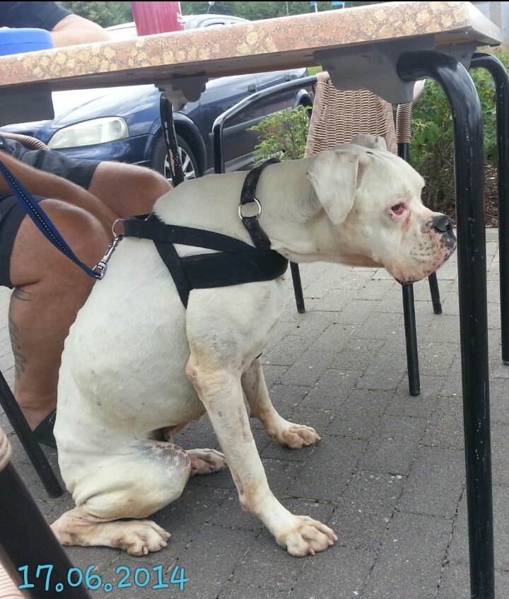 Neos ist ein Albino-Boxer. Er wurde in der Nähe von Alicante aufgefunden. Dort muss er mindestens schon 10 – 14 Tage ausgesetzt gewesen sein. Sein Zustand war sehr schlecht – fast verhungert und verdurstet.
