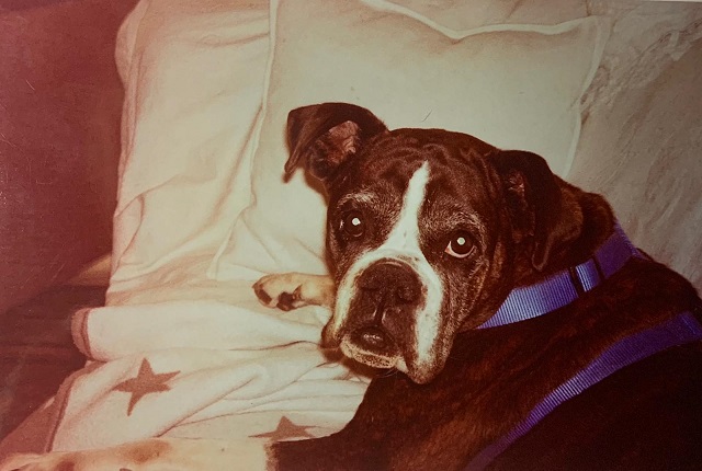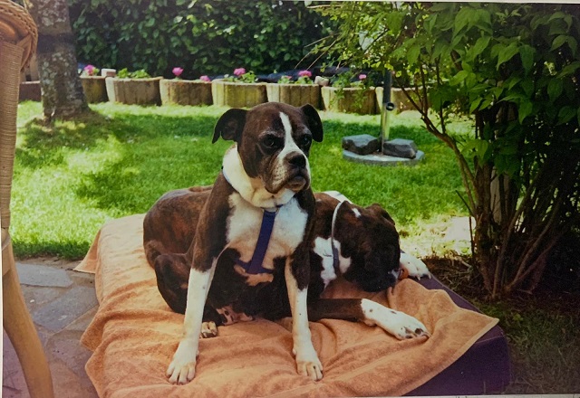 Wir sind ein netter Seniorenclub: Boxer Harley, ich Nolina und Frauchen…..sie hat viel Zeit für uns.