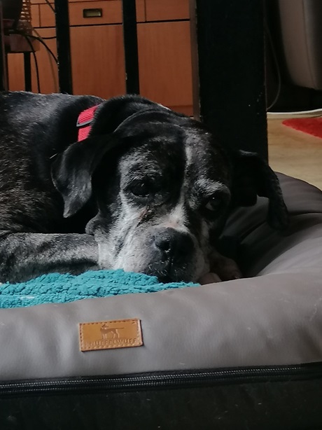 Noch verfolgt sie Frauchen überallhin, aber mit der Zeit wird sich das geben und sie wird angekommen sein. Ihr Hundebett findet sie auch richtig gut – endlich ein weiches Plätzchen in Sicherheit.