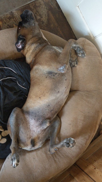 Calypso ist ein sehr lieber Boxer. Er läßt einfach alles über sich ergehen und dies trotz seiner Schmerzen, die über Medikamente erst mal gelindert werden.