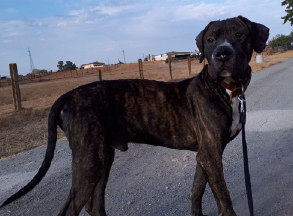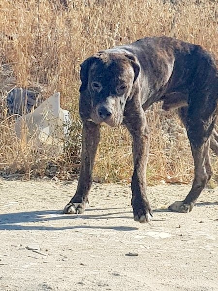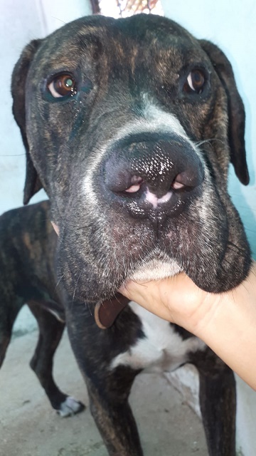 Als ein gestromter Boxer – Doggen Mix Rüde von unseren Partnern in einem Waldstück gefunden wurde, war er völlig verwahrlost, aufgequollen und abgemagert.