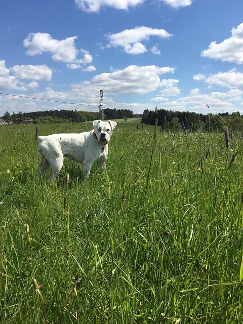 Sie lebt nun mit 2 Vierbeinern und 3 Zweibeinern zusammen. Mit der Boxerhündin kann sie so richtig toben. Im Umgang mit dem kleinen Terriermix braucht sie noch klare Ansagen.
