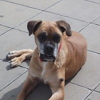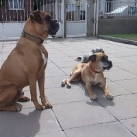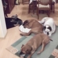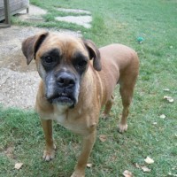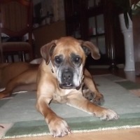 Wesen: liebe alte Boxeromi, verträglich mit Artgenossen, aber mag keine Katzen