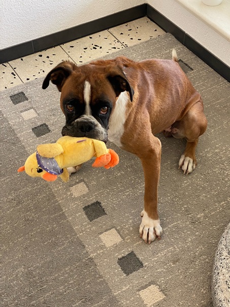 Zu Hause habe ich die Wohnung, das Haus und den Garten erkundet, ganz viel geschnuppert und trotz den vielen unbekannten Dingen (wie abgefahren ist bitte ein elektrisches Rolladentor!) und Situationen, zeige ich mich sehr ausgeglichen (außer bei Spielsachen, Bällen und Stöcken, da lass ich die Sau beziehungsweise den Boxer raus- das ist wahrscheinlich das einzige, was mir beigebracht wurde, meine Mitmenschen zu unterhalten- was ich ausgezeichnet kann 😂). Manche Situationen kenne ich noch nicht, aber ich bin mutig und meine Mama zeigt mir, dass es mich gar nicht gruseln muss. Ich lerne so viel jeden Tag, das ist so wunderbar!