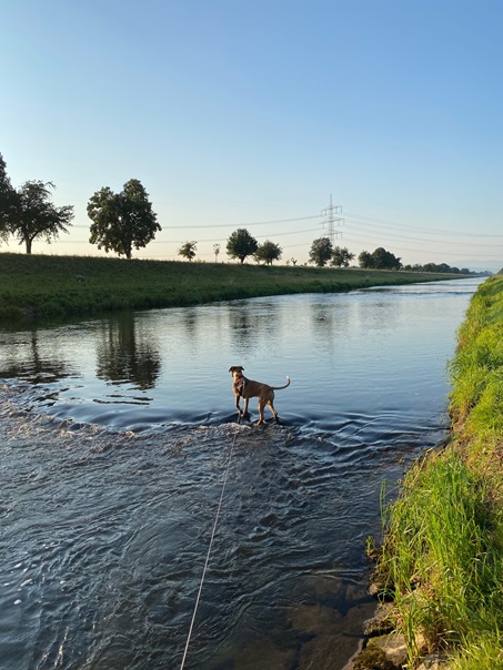 An meinem Ankunftstag war es sehr heiß in Deutschland, aber das bin ich ja aus dem Süden von Spanien gewohnt. Daher ging unser erster gemeinsamer Gassigang direkt an einen Fluss, da habe ich ganz schnell verstanden, dass es unter Wasser Steine gibt, über die man laufen kann, so dass man nicht schwimmen muss.🤗