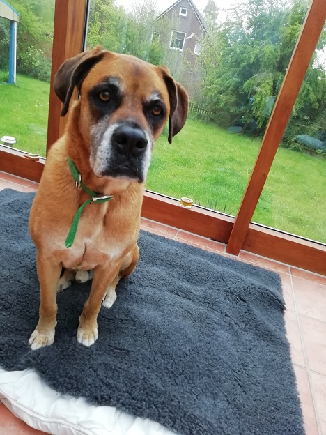Er ist für sein Alter gut drauf und ein ganz toller Bursche. Er versteht sich prima mit unserer 2 jährigen Boxer Mix Dame Vista und lebt sich hier gerade richtig gut ein. Zuerst fand er es gruselig durch die Haustür ins Haus zu gehen und wir sind mit ihm über die Terrasse und die Hintertür rein.