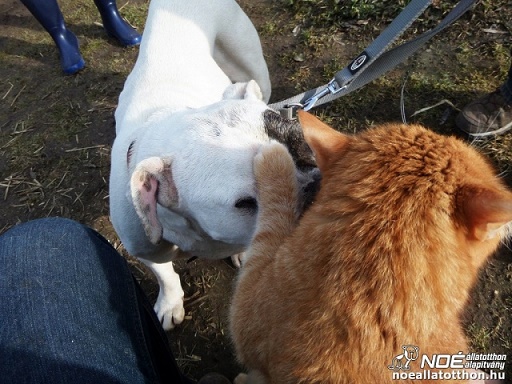 Piggy versteht sich gut mit allen anderen Hunden, jedoch schützt sie sich selbst, wenn ihr Gefahr droht. Selbst Katzen sind kein Problem für sie.
