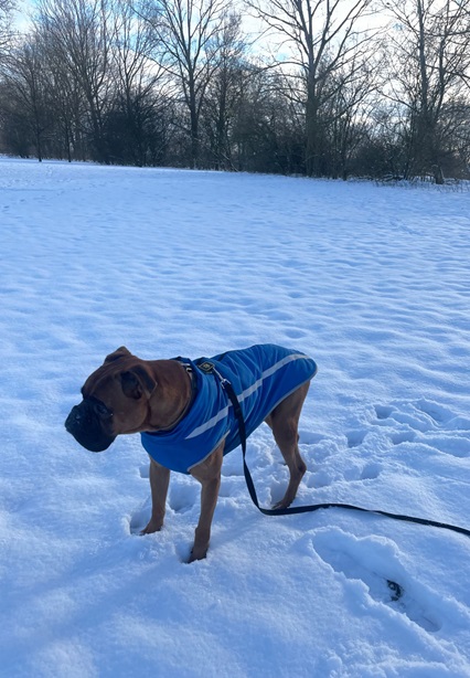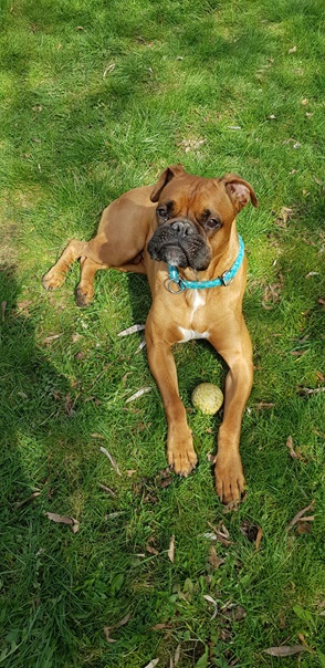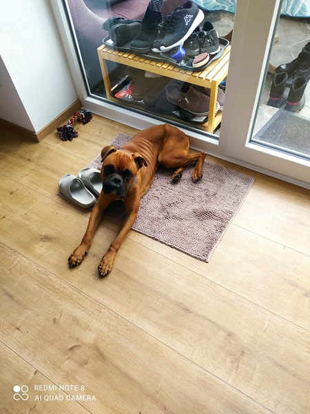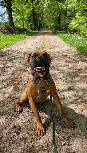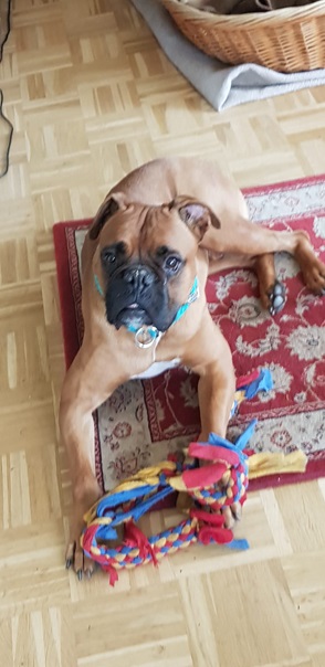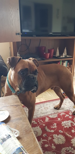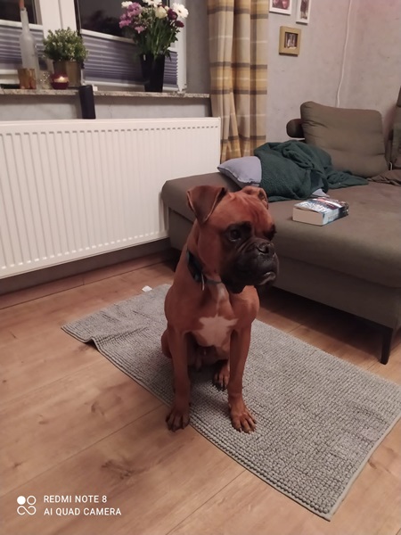 Zu Menschen bin ich aufgeschlossen und freundlich. Bin noch boxertypisch sehr stürmisch und will alle ganz doll begrüßen. Das müssen wir dann noch üben 🙂 Vor allem, euere Kinder müssen dann standfest sein, also besser Teenies. Alleine musste ich noch nicht lange bleiben, aber wenn mein Pflegefrauchen kurz einkaufen war, hab ich ganz brav in meinem Körbchen auf sie gewartet. Ich schlafe Nachts durch und träume dann über meine eigene Familie, die mich ganz dolle lieb hat und mit mir durch Dick und Dünn geht.