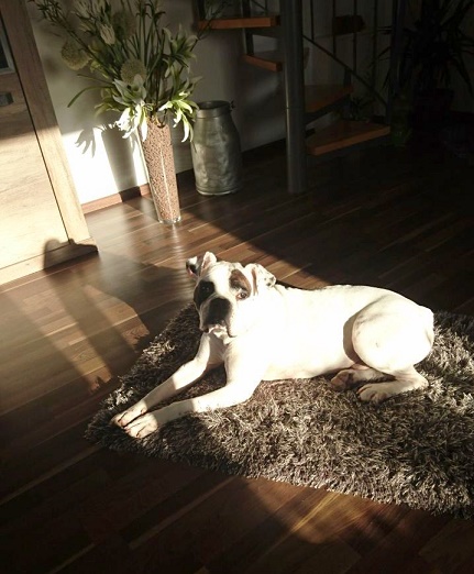 Abends als Ritual vorm schlafen gehen haben wir immer Kuschelstunde und wir erzählen uns vom Tag. Dabei nimmt er immer seine Pfote und legt sie mir auf die Schulter, sieht mir tief mit seinen rehbraunen Augen in meine und schenkt mir seine ganze Liebe.