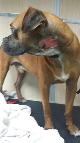 Wenn man seine Wunden versorgt, macht er nicht die geringste Bewegung und erträgt wie ein Held die Schmerzen. Ausserdem fehlt ihm ein halbes Ohr. Wir können uns vorstellen, dass man versucht hat diese selber zu kupieren.