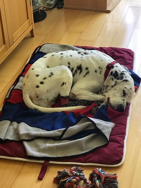 Alleine bleiben ist auch kein Problem, das haben wir hier mehrfach ausprobiert, ob ganz allein oder mit meiner Hundefreundin.