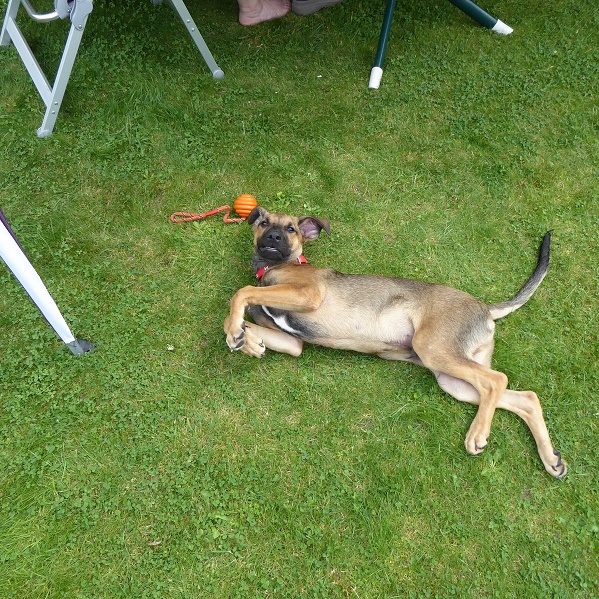 Naja, ich habe wirklich immer gute Laune und und springe fröhlich durch den Garten. Meien Familie liebt es mich zu beobachten, wenn ich mit einem Ball oder auch nur einem Stock durch den Garten tobe und mein Spielzeug durch die Luft werfe.