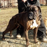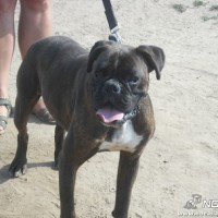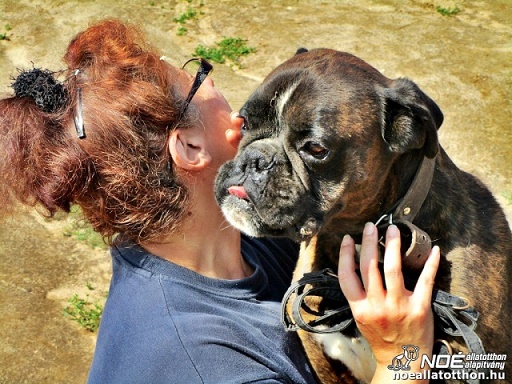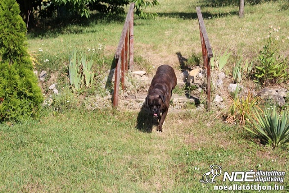 Ein reinrassiger, gestromter Boxerrüde mit schwarzer Maske, den sein Halter an die Boxer Rassenrettung des NOAH Tierheim Ungarn, aufgrund der gesundheitlichen Probleme des Hundes abgegeben hat.