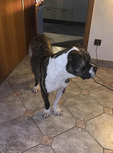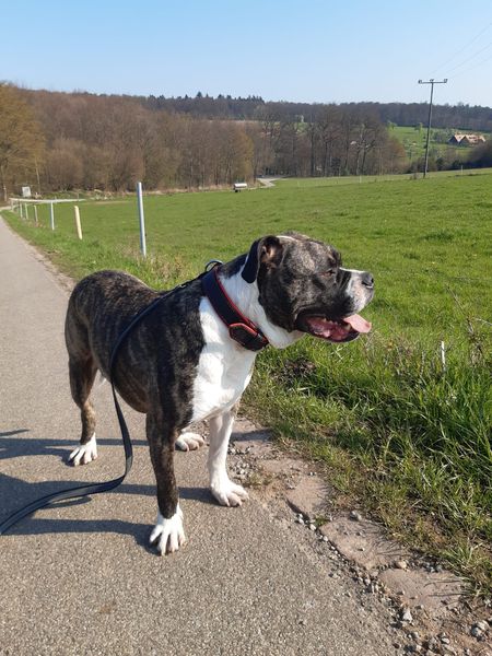 Ich bin immer in Bewegung, laufe rein und raus, aber am allerliebsten in Begleitung. Pferde finde ich nicht so toll, Kleintiere (Kaninchen) sehe ich als Spielzeug für mich an und daher sollten diese sicher verwahrt sein. Ich bin groß und kräftig/muskulös. Also 38 kg müsst Ihr schon halten können!