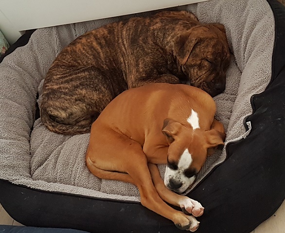 Wir kauen zusammen Knochen und jagen über die Wiesen. Manchmal stinken wir so nach Wildschweindreck das wir zusammen duschen müssen. Ich finde das toll. Knuth weniger…na dann ärgere ich ihn einfach ein bisschen und schon hat er wieder gute Laune.