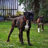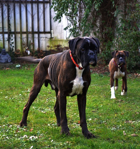 Er hat sich mit der bereits vorhandenen jungen Boxer-Dame angefreundet und beide genießen das Zusammensein.