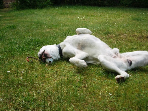 Ein großes Vogelvieh hatte sich da versteckt im hohen Gras. Ich also von Eins auf Hundert losgedüst, blöd nur, dass ich an einer ganz langen Leine war die mich dann voll ausbremste.