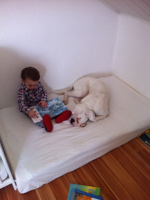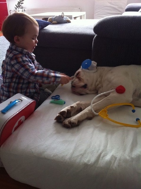 Ich fühle mich hier s.. äähhhh…..hundewohl! Herrchen und Frauchen machen für mich alles und das kleine Menschenjunge habe ich sooooo ins Herz geschlossen! Da lasse ich gerne das Doktorspiel mit mir spielen! Mein Hundepapi sagt, dass sie sich freuen, mich kennengelernt zu haben und mich nie mehr hergeben werden! Pah, ich werde doch nicht dort weggehen, wo ich mich wohl fühle, wo es warm ist, ich genug Knuddeleinheiten bekomme und ich endlich erfahren darf, wie schön es sein kann, Hund zu sein! Außerdem, ganz im geheimen…… hier gibt es tolle Leckerchen!!! Schon alleine deswegen bleibe ich hier! So!