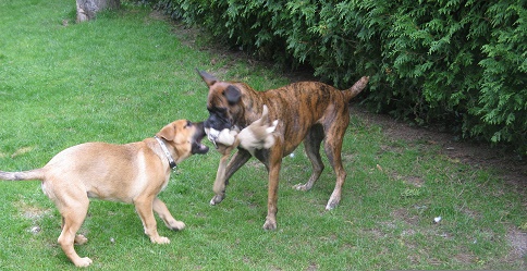 Meine Familie besteht jetzt aus zwei Zweibeinern, meiner großen Schwester, einer Boxerhündin und einem alten etwas quängeligen Kater.