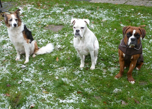 Heute fiel der erste Schnee hier an der Nordsee, Teddy fand´s toll!