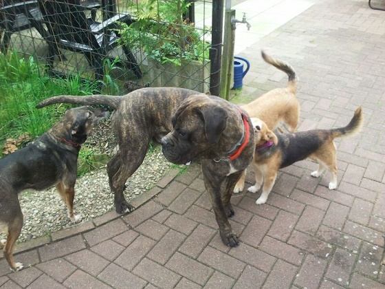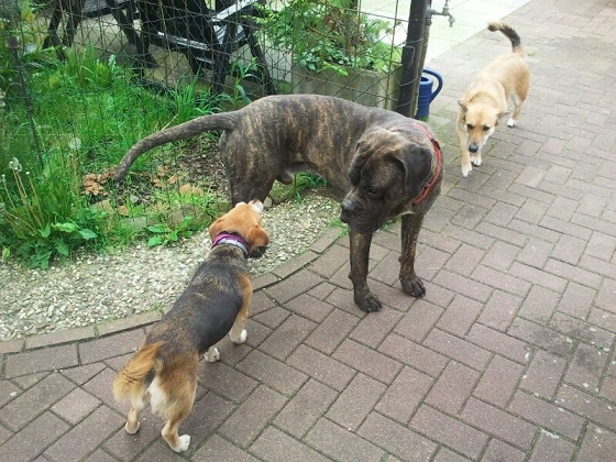 Zuerst bin ich hier in Pflege eingezogen. Ich, das Riesenbaby kam in ein schon bestehendes Rudel . Null Problemo für mich! Wir sind hier eine richtig tolle Hundegruppe , wohnen in einem Riesenhaus mit einem Riesengarten. Es ist eigentlich immer was los und ich kann spielen und toben nach Herzenslust.