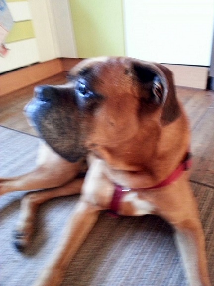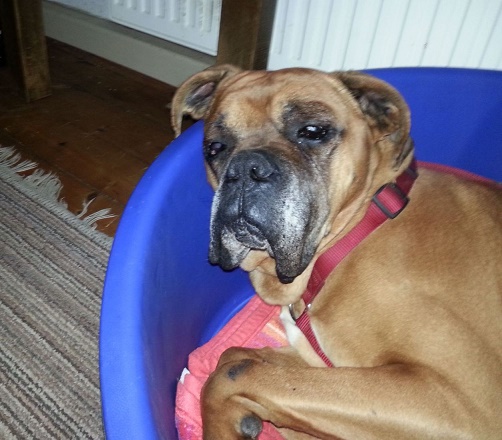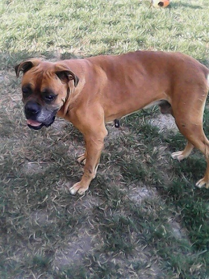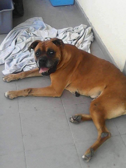 Dieser ältere Boxer wurde von der Straße übernommen. Zunächst war er auf einem Firmengelände, wo man ihn fütterte. So konnten Tierschützer vor Ort ihn aufnehmen.