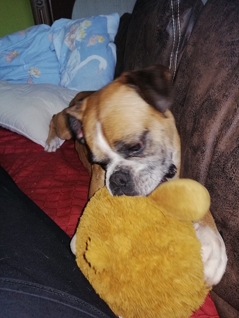 Von Boxerrüde Aaron wurde sie lieb mit einem Küsschen begrüßt. Nach einem ausgiebigem Nachtmahl, nahm sie Aaron’s Körbchen in Besitz, denn das neue Körbchen mit Baldachin und ohne Kuschelmulde gefiel ihr gar nicht.