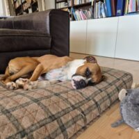 Wir gehen dann immer stundenlang im Wald spazieren, so viele Bäume dicht an dicht. Wie das riecht und duftet, ich bin dann wieder total platt und hau mich gleich zuhause auf meine dicke Matte. Nette Hunde gibt es auch in der Nachbarschaft, die waren auch froh, dass wieder eine Neue dazugekommen ist.