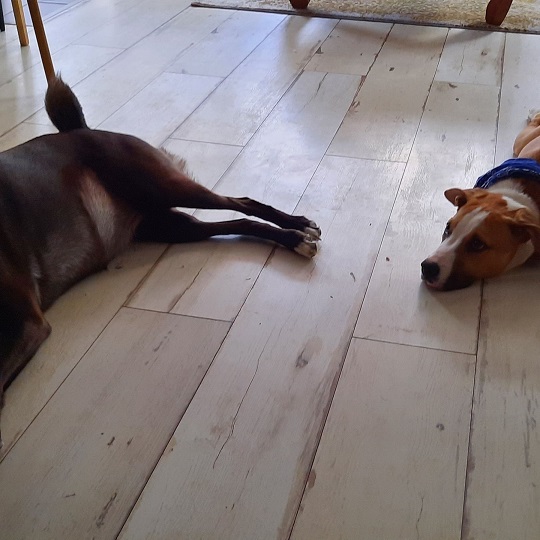 Meine Mitbewohner gewöhnen sich so langsam an mich. Die Katzen sind mir noch ein bissel ungeheuerlich, weshalb ich sie manchmal gerne durchs Haus jage. Meine Hundefreundin findet mich langsam auch gut und spielt sogar mit mir.