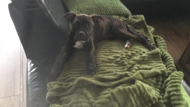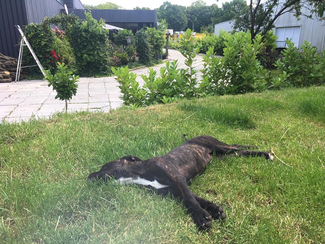 In seinem neuen Zuhause erkundet er alles und wagt sich in den Pool. Frauchen sagt er sei mutig, fange an sein Revier zu bewachen und nehme ganz viele Kuscheleinheiten in Anspruch.
