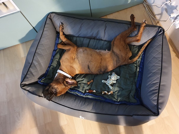 Die erste Woche war ich noch etwas zurückhaltend. Man weiß sich ja zu benehmen. Ausserdem wollte ich eigentlich nur schlafen und fressen. Gesundheitlich war ich auch noch nicht so auf dem Damm. Aber nach tierärztlicher Behandlung und superreichhaltigem Futter, ging es mir von Tag zu Tag besser. Meine Frauchen sagen inzwischen, dass ich ziemlich frech geworden bin, aber dabei lachen sie immer. Ich habe schon soooo viel gelernt. Ich weiß was meine Menschen wollen, wenn sie „sitz, platz, Pfötchen, Küsschen, Korb, Fuß,
