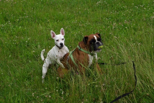 Ich lebe hier mit einer lustigen kleinen Hündin zusammen, mit der ich gerne spiele und tobe.